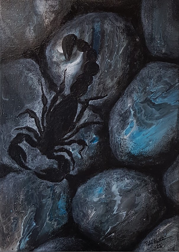 Akryyli kankaalle. 2 x (24x18) 2022. Yhdistetty saranoilla. Voidaan asettaa normaalisti vierekkäin tai noin 130 asteen kulmaan seinälle. Teoksen taakse voi myös sijoittaa liiketunnistimella varustetun valaisimen, jolloin valo syttyy kun teosta lähestyy.