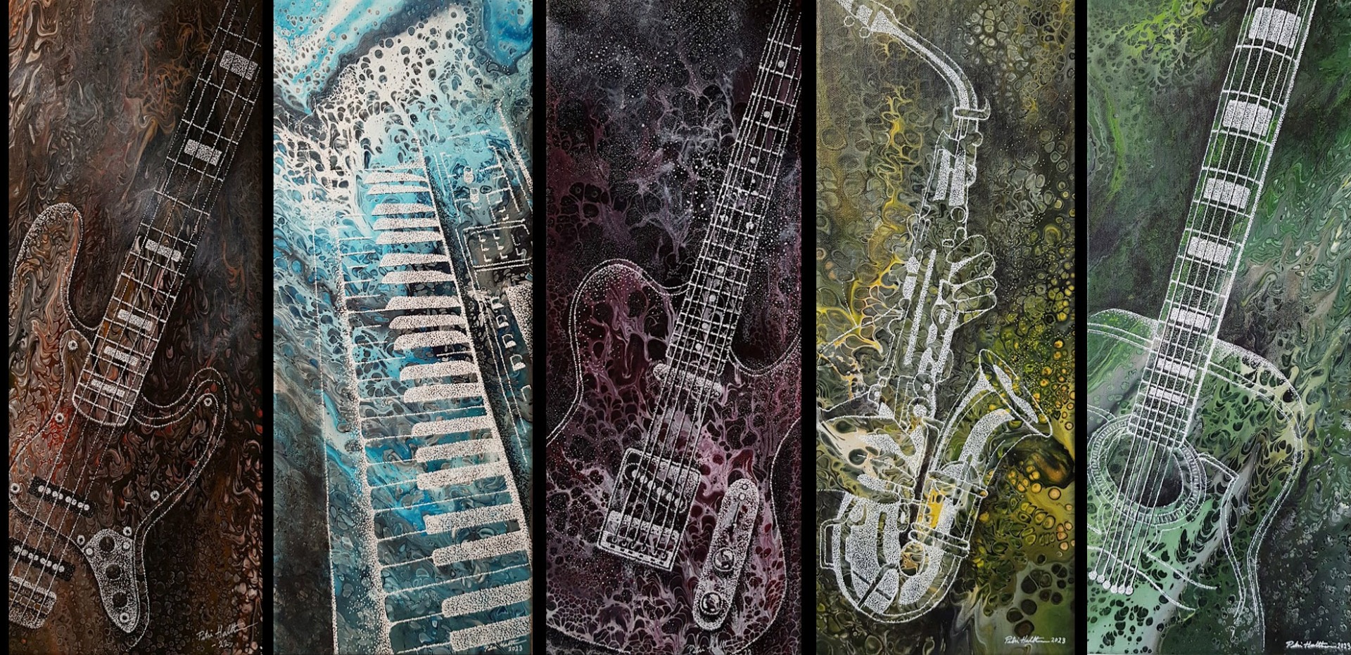 "Hyytävää"-sarja. Akryyli kankaalle 2022. Koostuu (30x60) kokoisista maalauksista. ( 3.8cm syvä deepedge pohja) Tälle maalaussarjalle olen säveltänyt, sanoittanut ja sovittanut teoksen tarinaan liittyvän biisin.